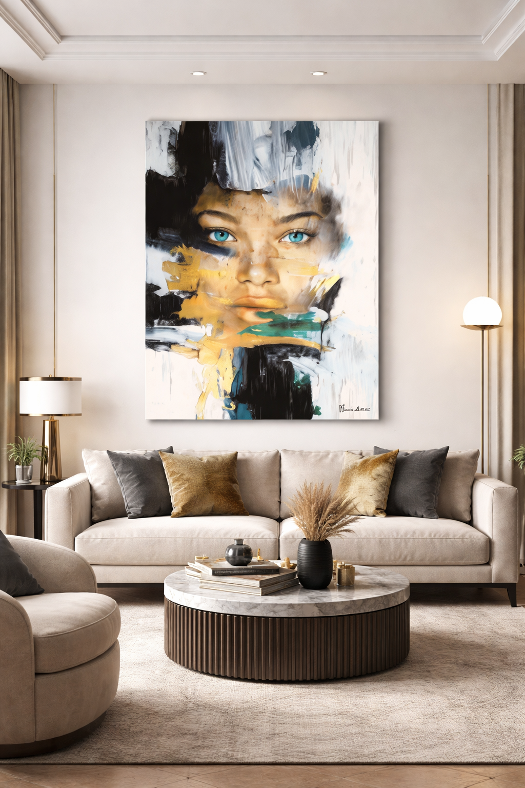 El cuadro Aurata Fusio destaca por su fuerza expresiva y su equilibrio entre lo abstracto y lo figurativo. La obra presenta un rostro femenino que emerge entre pinceladas intensas, creando una sensación de profundidad, misterio y sofisticación desde el primer vistazo.