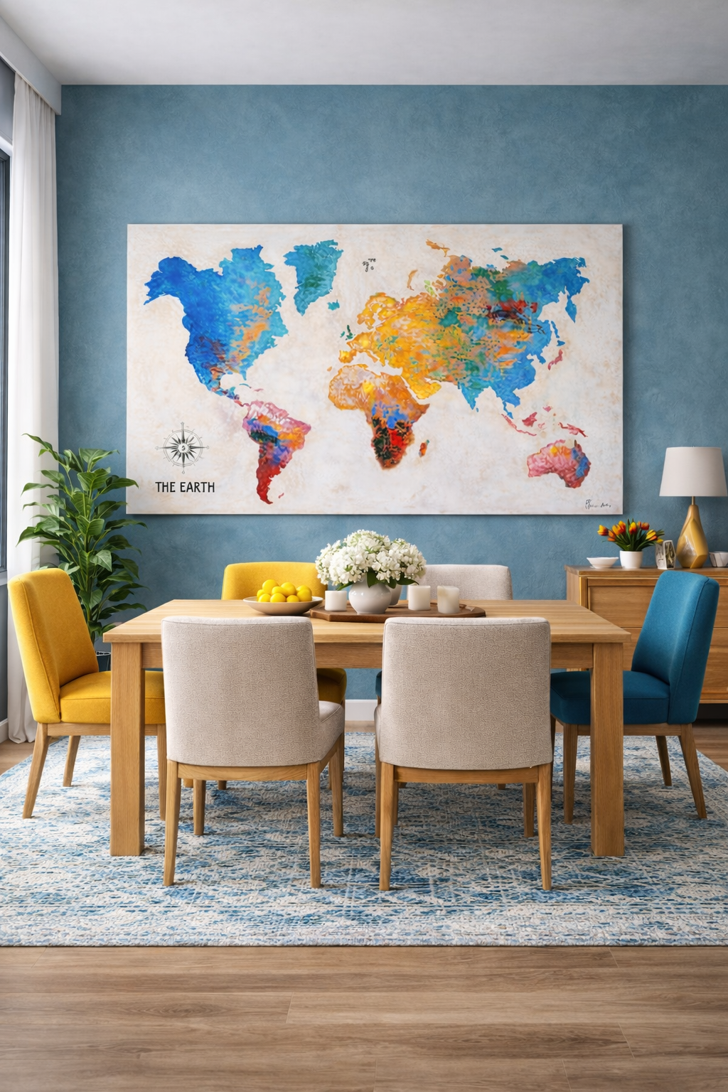 El mapamundi The Earth Colors es un cuadro decorativo contemporáneo que combina color, textura y relieve para dar vida a cualquier espacio. Desde el primer vistazo, la obra transmite energía y una sensación visual dinámica que invita a recorrer el mundo a través del arte.